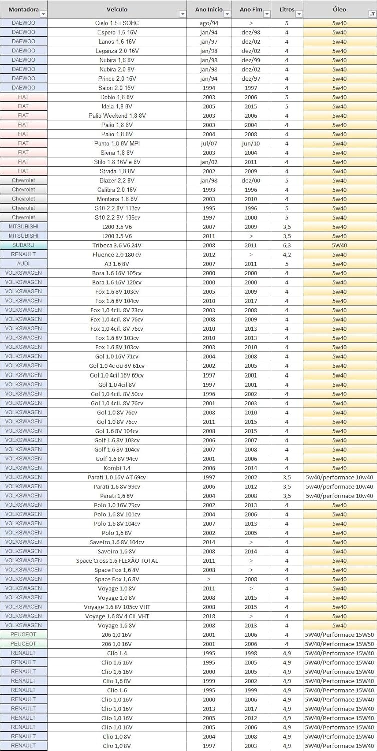 - AUDI A3 – DAEWOO – Cielo | Espero | Lanos | Leganza | Nubira| Prince| Salon – FIAT Doblo | Ideia | Palio | Palio Weekend | Punto | Siena | Stilo | Strada – GM CHEVROLET Blazer | Calibra | Montana | S10 – MITSUBISHI L200 – PEUGEOT 206 – RENAULT Clio | Fluence – SUBARU Tribeca – VOLKSWAGEN Bora | Fox | Gol | Golf | Kombi | Parati | Polo | Saveiro | SpaceCross | SpaceFox | Voyage